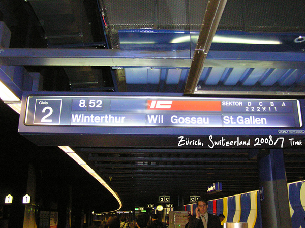 首先我們換了國鐵卷,可以在這個星期無限次數坐火車,我們是頭等艙票,可以看到時刻表右方有sektor DCBA下方有222x11,1是頭等艙,在後面,我們等等就要坐後面的車廂.目標是St.Gallen, 中途會經過Winterthur, Wil Gossau等站.