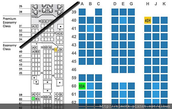 這次選位國泰航段TPE->HKG, HKG->LAX,回程的HKG->TPE的773都選40H,只有回程LAX-HKG選到60A