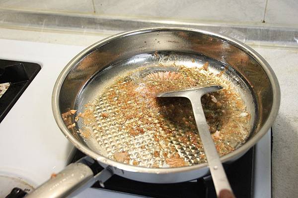 最後還是動用了菜瓜布才能把焦掉的魚肉刷掉,可是...不鏽鋼也被刮花了