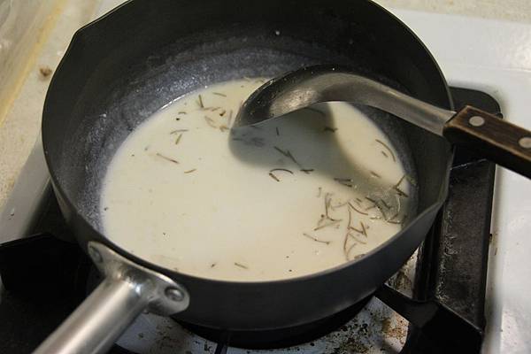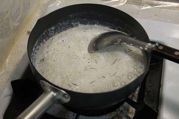 3.水份煮掉一半後,再倒入鮮奶再煮(濃縮)