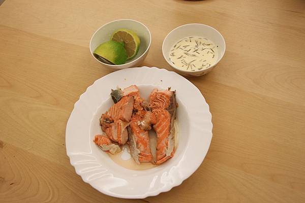 這就是我們今天的 煎蒸鮭魚佐蒜泥奶油醬