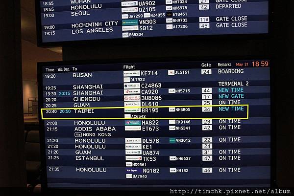查了一下看板,EVA BR195在Gate 34,時間從20:40改到20:50pm.很好,又多了十分鐘.