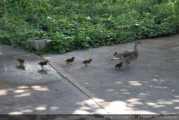 太酷了,居然有鴨媽媽帶著鴨寶寶在動物園裡走耶...